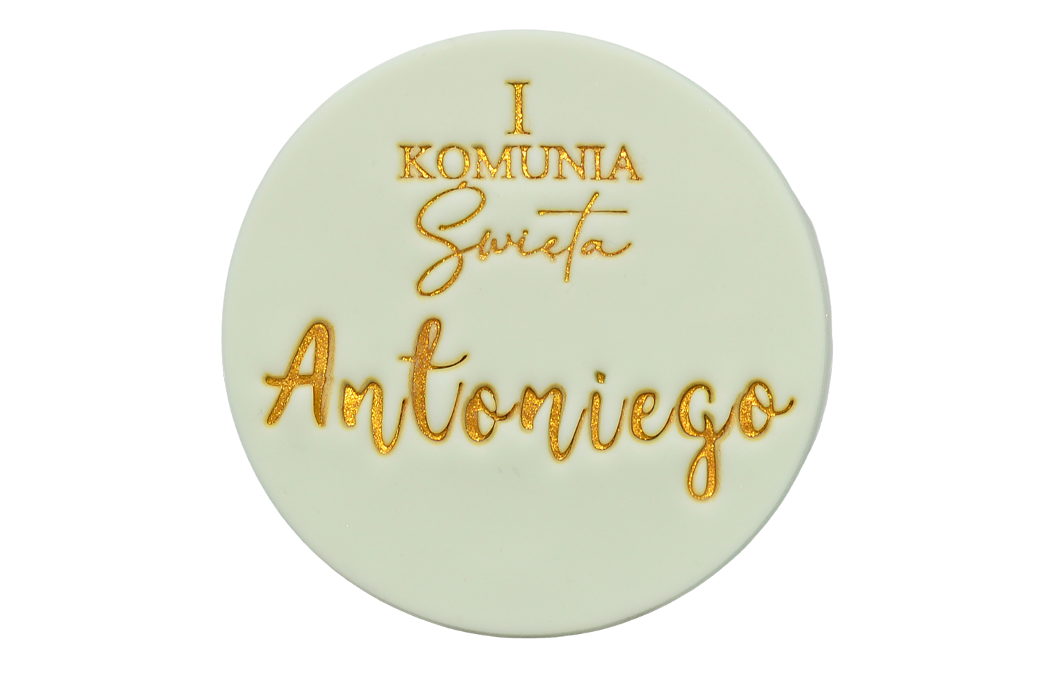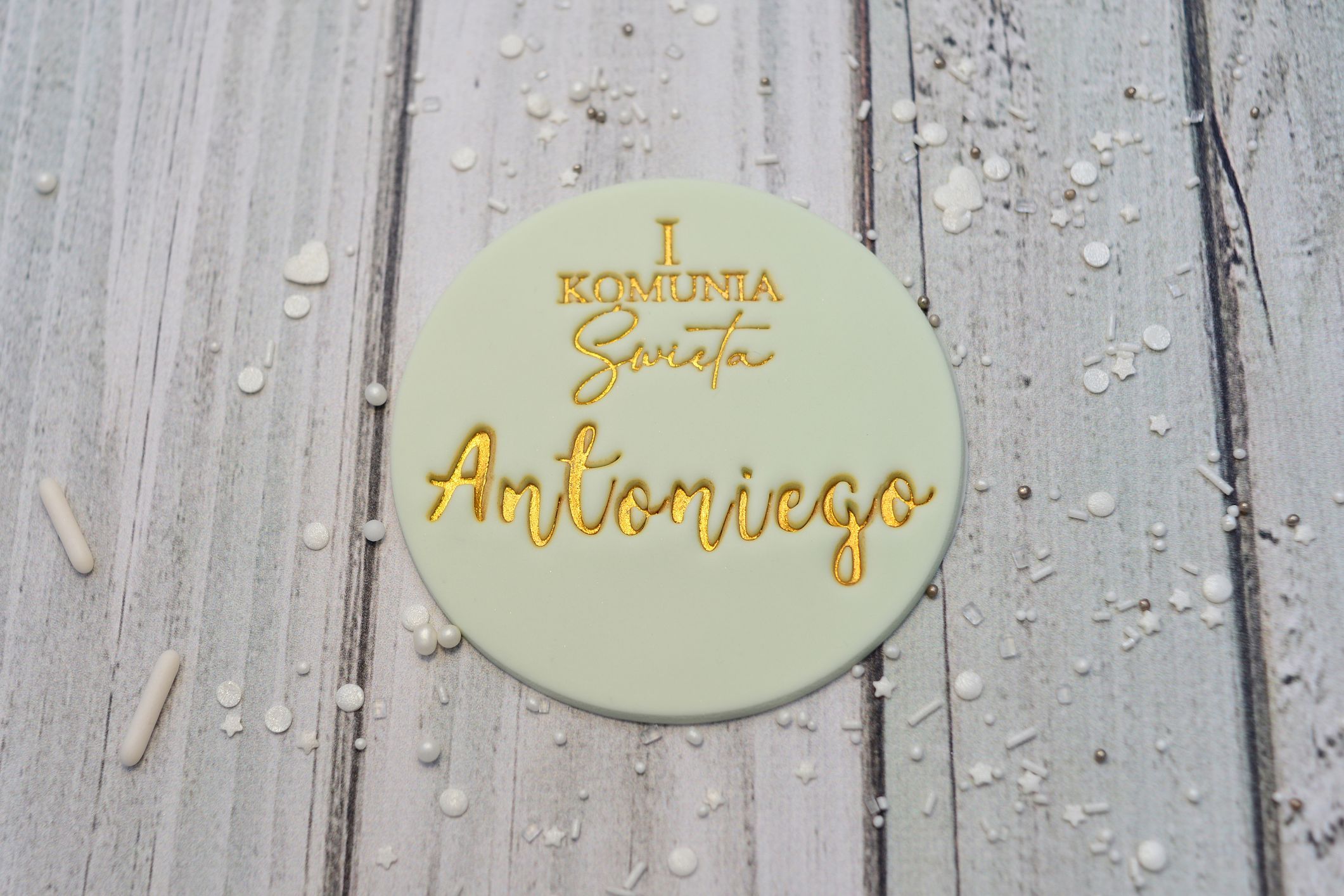 Dzięki personalizacji dekoracja staje się nie tylko ozdobą tortu, ale także piękną pamiątką z dnia Pierwszej Komunii Świętej. Klasyczny, okrągły kształt sprawia, że topper doskonale prezentuje się na różnych stylach tortów – zarówno minimalistycznych, jak i bardziej dekoracyjnych.