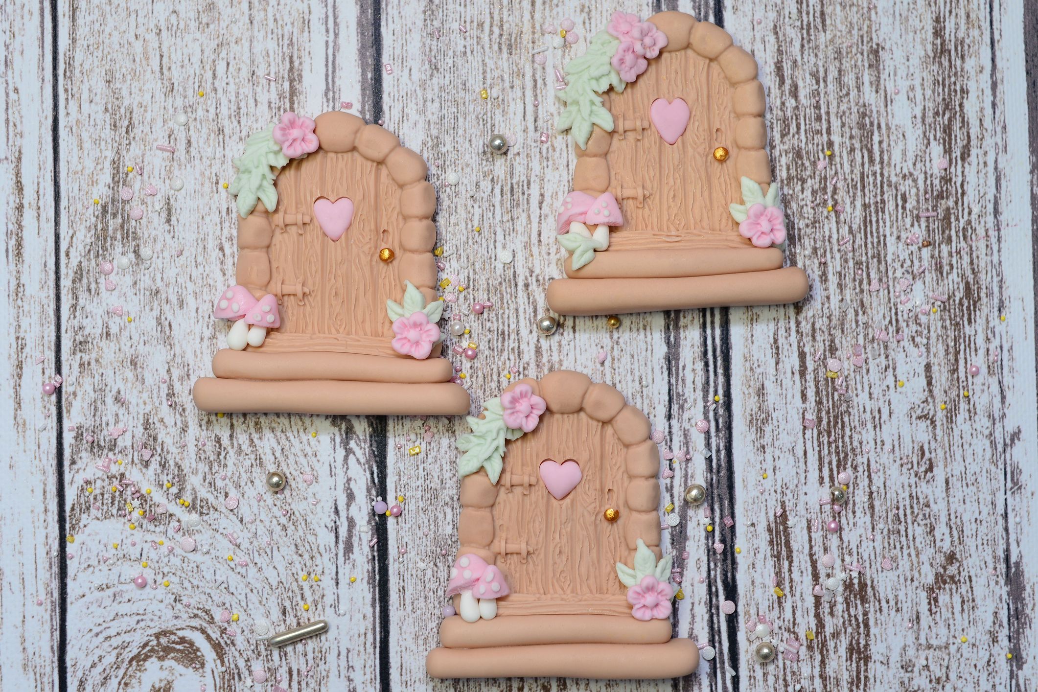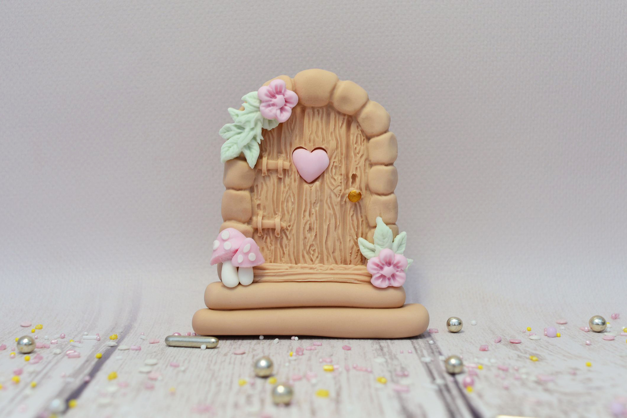 Beżowe drzwi z masy cukrowej, z serduszkiem i delikatnymi kwiatuszkami