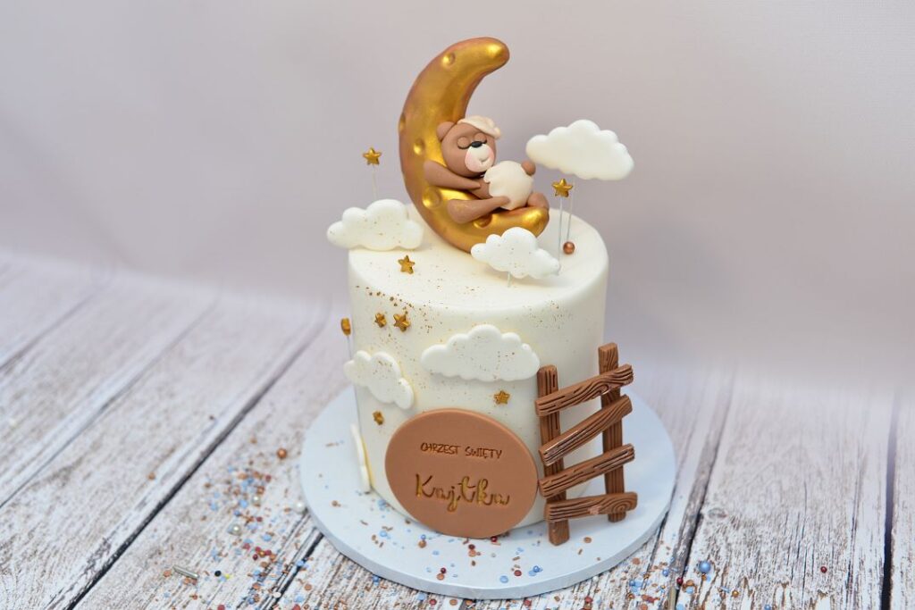 Baza tortu w odcieniach bieli ze złotymi akcentami to klasyka, która zawsze się sprawdza. Najwięcej emocji budzi jednak śpiący miś wtulony w złoty księżyc – symbol bezpieczeństwa, miłości i spokojnego dzieciństwa. Otaczające go chmurki i gwiazdki tworzą bajkową, niemal magiczną scenerię. A dekoracyjna drabinka prowadząca „na sam szczyt” pięknie dopełnia całość i nadaje tortowi wyjątkowego charakteru.